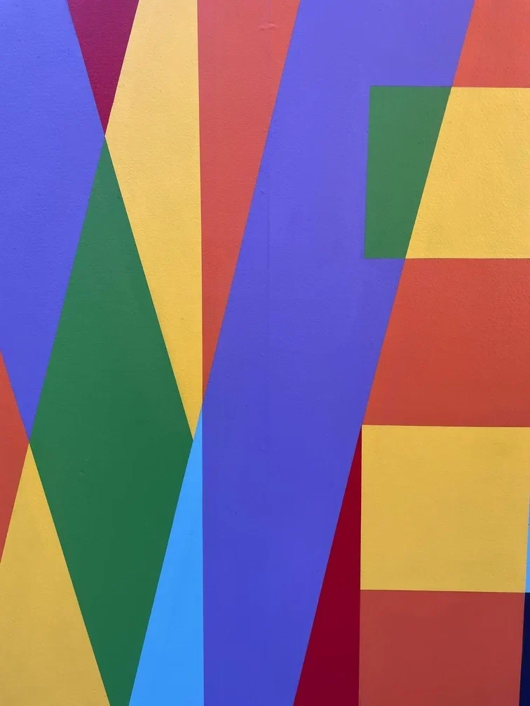 This outdoor mural features a bold typographic composition built around the word LOVE, using vibrant geometric shapes and layered colors. The design plays with transparency, rhythm, and contrast, creating a dynamic visual impact that stands out in an urban environment.