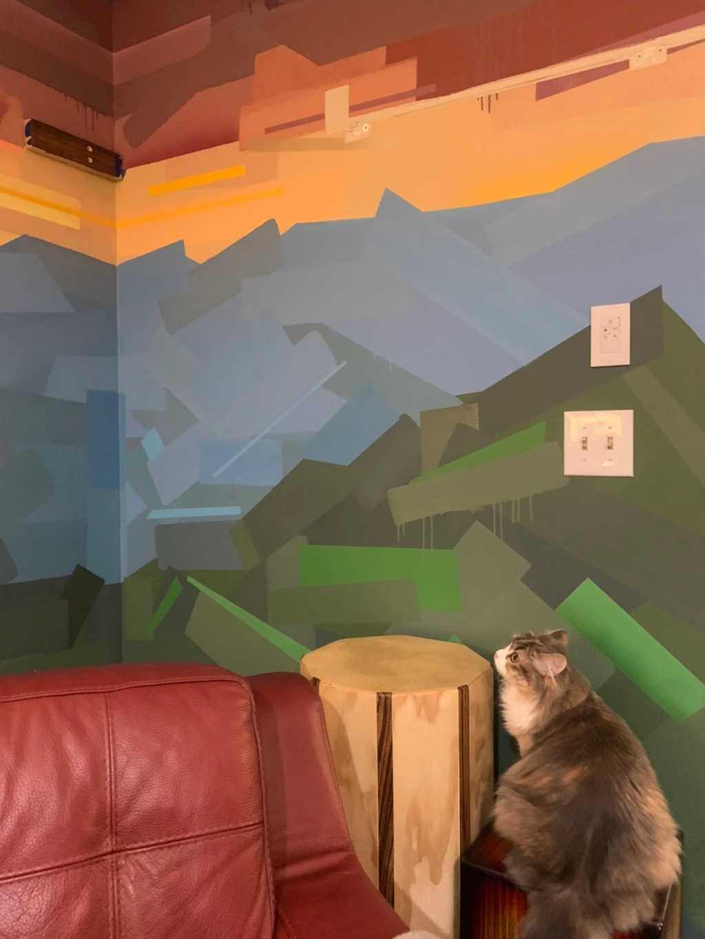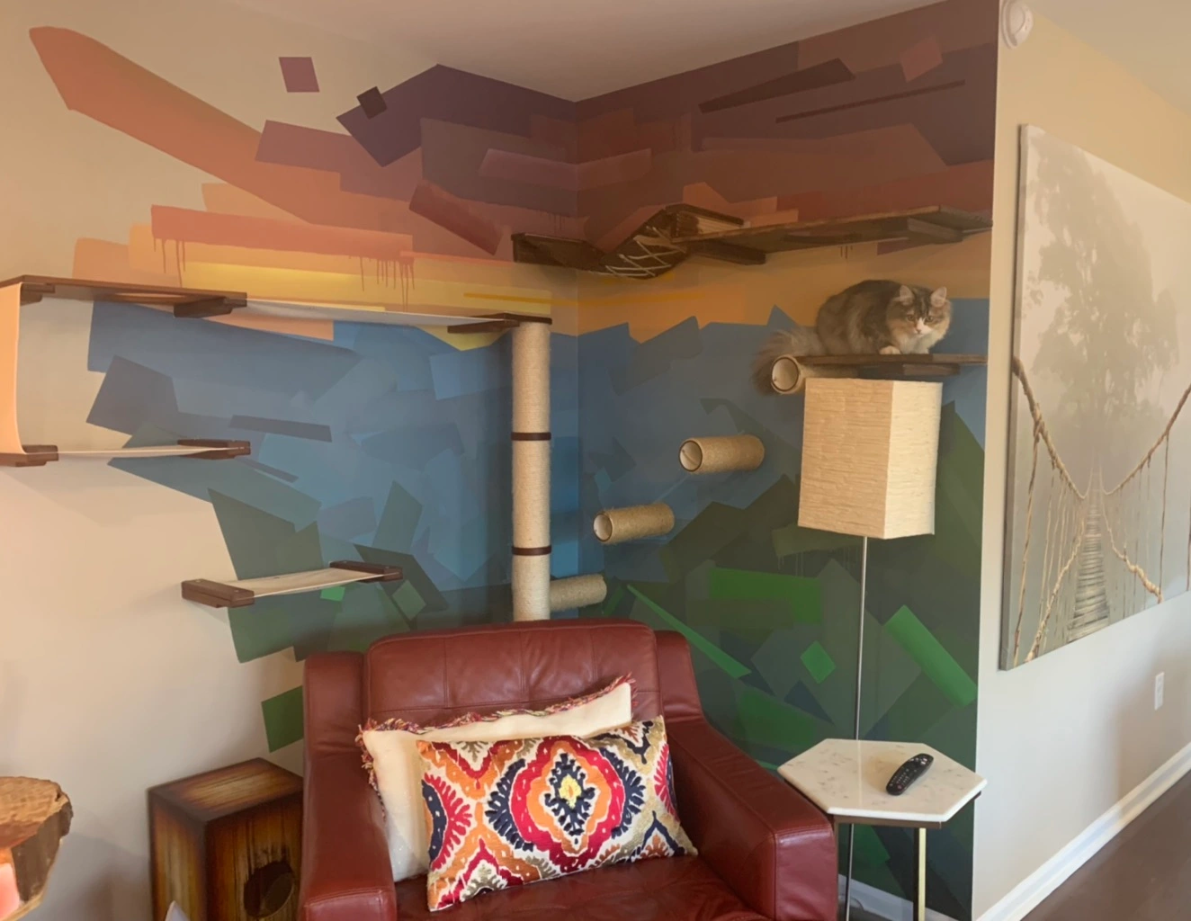 This custom residential mural was designed and painted for a private home, transforming a corner seating area into a calm and visually engaging space. The client wanted an abstract design with a nature-inspired theme, blending organic forms and layered colors to create a peaceful indoor landscape. The mural was thoughtfully integrated into a multi-functional area that includes a seating nook and a custom cat-climbing and shelving system. The abstract shapes and natural color palette help unify the space, making it both relaxing for everyday use and playful for the home’s pet. This indoor residential mural adds depth, warmth, and artistic character while enhancing the overall atmosphere of the living area.