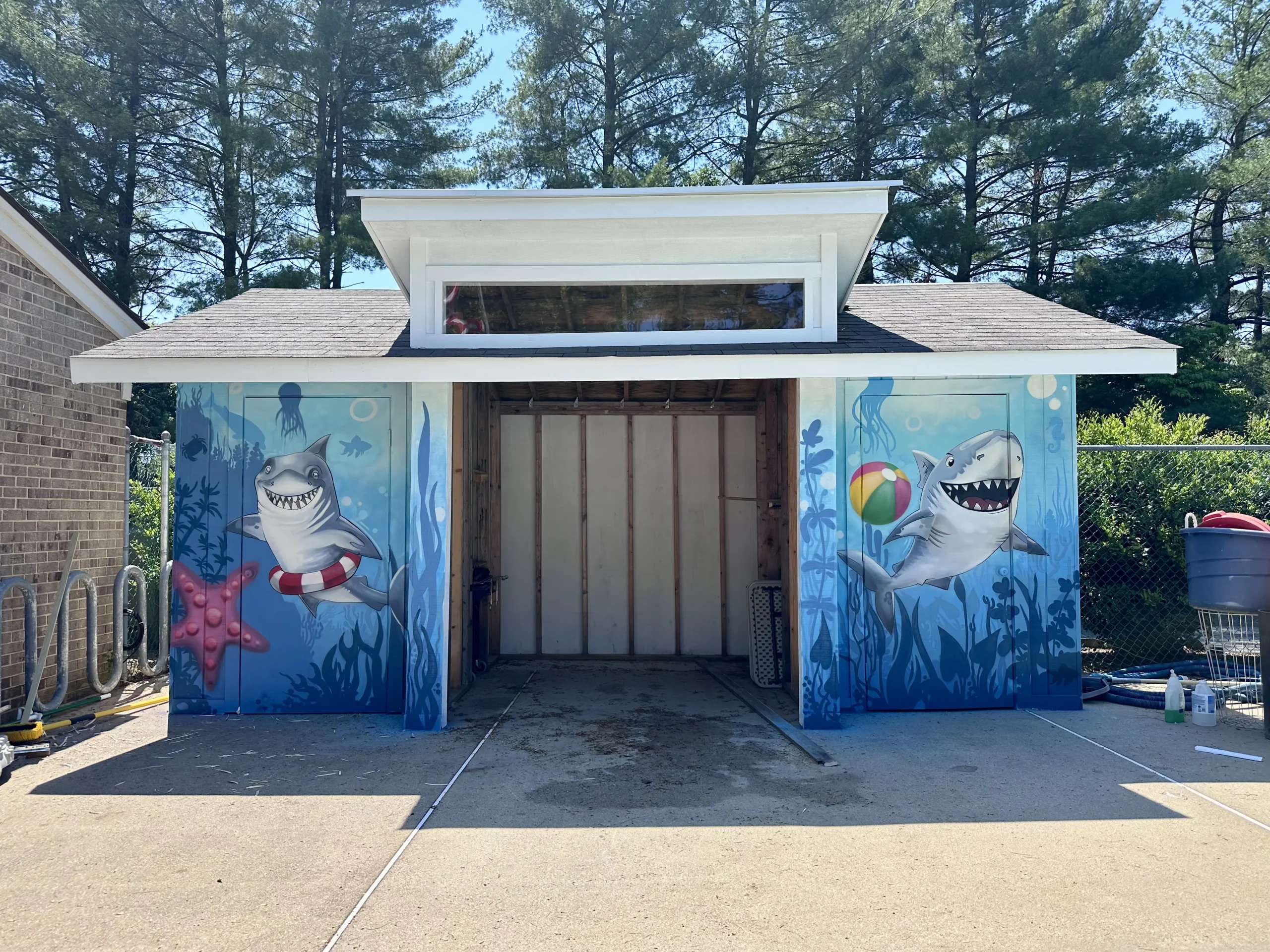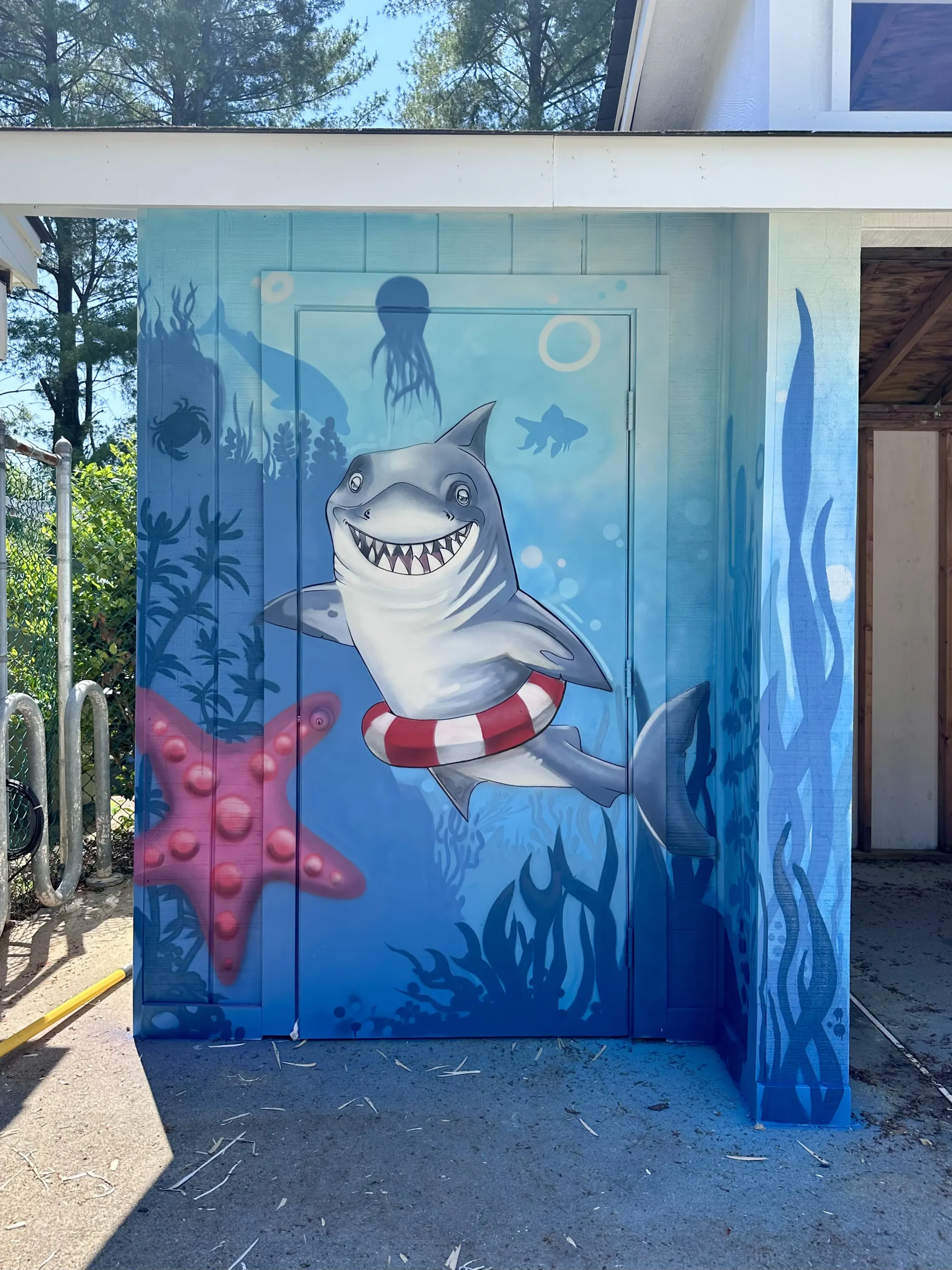 This mural was created for the "Eldwick Swim and Tennis Club" near swimming pool kids’ area. The idea was to paint a funny and cheerful underwater scene featuring cartoon sharks, which are the pool’s mascot. It adds a playful, kid-friendly vibe right next to the swimming area, making it a fun and welcoming spot for children.